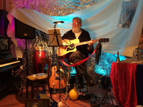 Zuerst überraschte Rolf Scholze die Besucher mit einer Bühne, die liebevoll mit diversen Gegenständen aus der Seefahrt dekoriert war. Zu Beginn der Veranstaltung stellte er den Autor Marc Bielefeld vor, aus dessen Buch „Wer MEER hat braucht weniger – Über den Rückzug auf ein altes Segelboot“ er im Laufe des Abends einige Passagen vorlas. Dabei zog Rolf Scholze die Zuhörer schnell in seinen Bann. Musikalisch unterstützte er die Lesung gekonnt durch mehrere thematisch passende Lieder, die er auf der Gitarre begleitete.