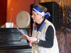Der Nachmittag begann mit einer Überraschung, indem die etwas irritierte Putzfrau Ekaterini Sisyphos mitteilte, dass Heidi de Vries leider verhindert sei und die anwesenden Zuhörer nun mit ihr vorliebnehmen müssten. Danach nahm sie in ihrer temperamentvollen Art sofort die Möglichkeit wahr, aus Fundstücken von Schmäh- und Protestbriefen zu zitieren, die sie im documenta-Archiv gefunden hatte.